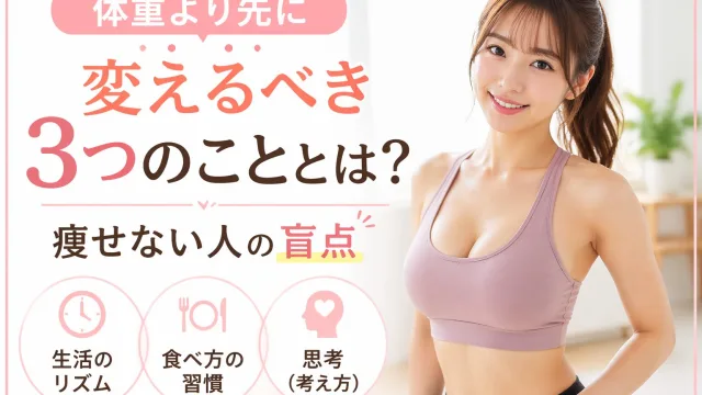 ダイエットで結果が出ない人の多くは、「体重」ばかりに意識が向いています。しかし本当に変えるべきは、体重ではありません。体重より先に変えるべき3つのことは以下です。「生活のリズム」「食べ方の習慣」「思考(考え方)」この3つを整えることで、自然と体重は後からついてきます。